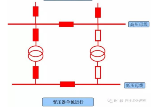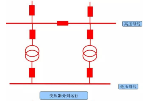 2.分列運行:兩臺變壓器高壓側(cè)母線并列(或分開)運行,低壓側(cè)母線聯(lián)絡(luò)斷路器分開運行。